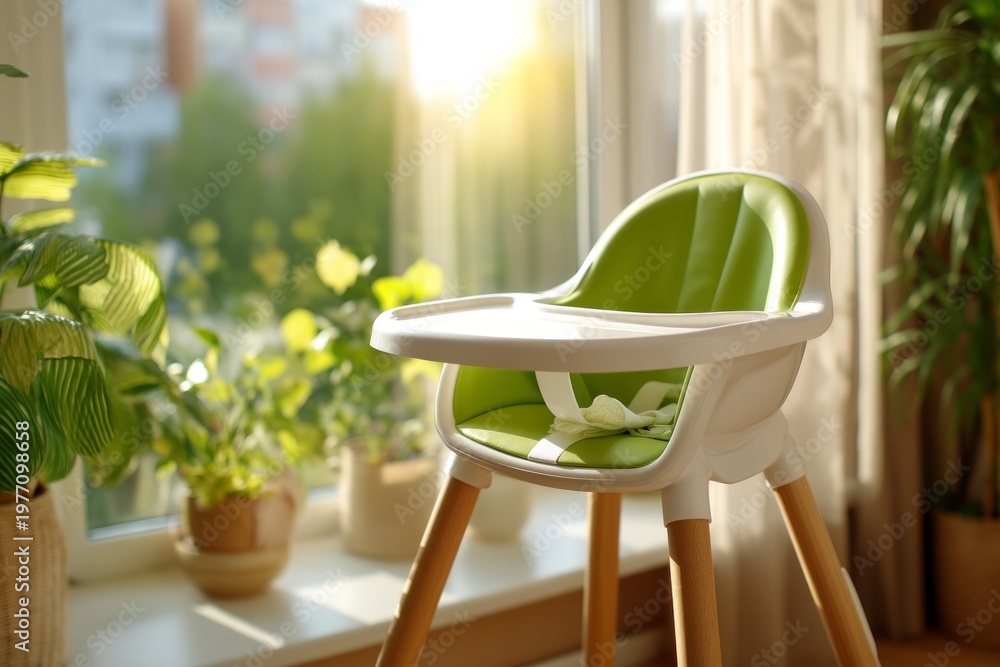 Bright and Cozy Feeding Chair Near Window Surrounded by Plants in a Sunlit Room #1977098658