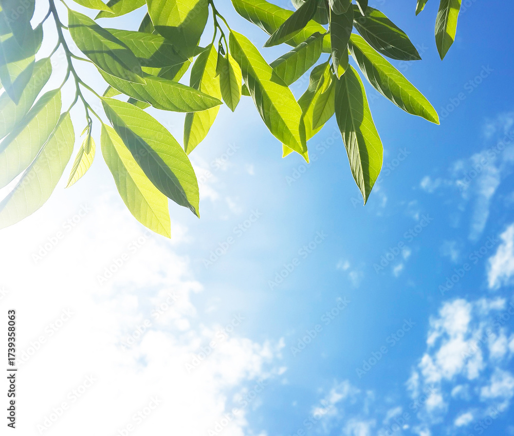 Bright green leaves against a clean sky background, captured in square mobile photography with highlighting nature’s freshness and simple beauty. #1739358063