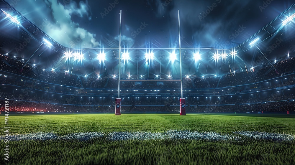 Bright Rugby Stadium Lights Illuminate Nighttime Match with Large Enthusiastic Crowd, Green Grass Field, and Rugby Goal Posts in a Photorealistic Wide-Angle View of Sports Event Atmosphere #914721187