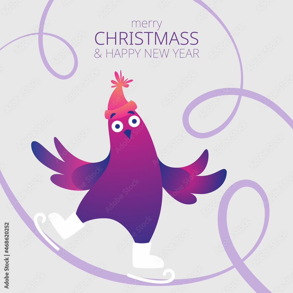 Bright square Xmas banner with funny pigeons. Text "Merry Christmas". Funny characters doves in skates. Pigeons are skating on the ice rink. Holiday vector illustration. #468620252