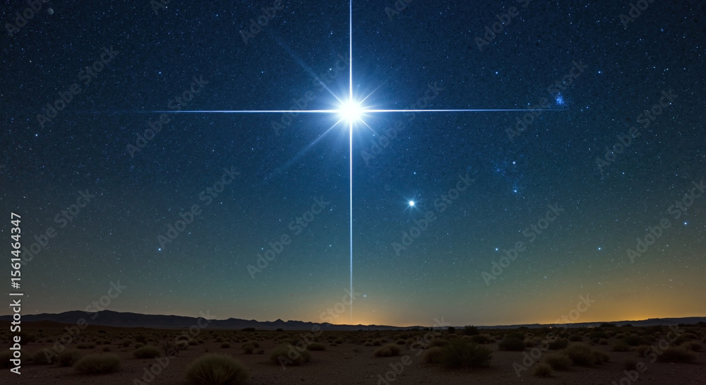 Bright star with cross beams over desert landscape at night sky. Astronomy space concept. Stargazing, celestial observation, night photography. Christmas star, observatory tours, telescope sale banner #1561464347