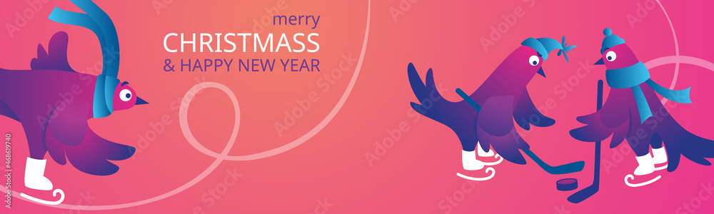 Bright Xmas horizontal web banner with funny pigeons. Text "Merry Christmas". Funny characters doves in skates. Pigeons are skating on the ice rink. Holiday vector illustration. #468619740