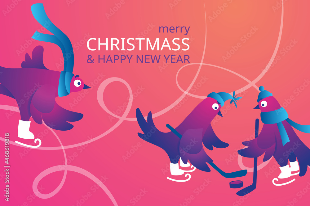 Bright Xmas horizontal web banner with funny pigeons. Text "Merry Christmas". Funny characters doves in skates. Pigeons are skating on the ice rink. Holiday vector illustration. #468619818