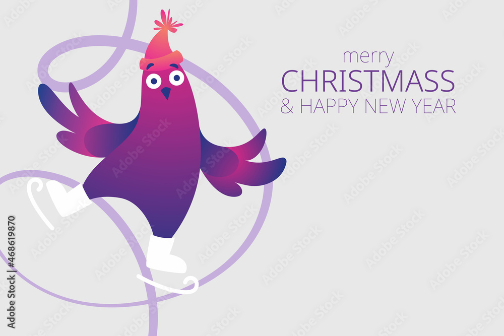 Bright Xmas horizontal web banner with funny pigeons. Text "Merry Christmas". Funny characters doves in skates. Pigeons are skating on the ice rink. Holiday vector illustration. #468619870