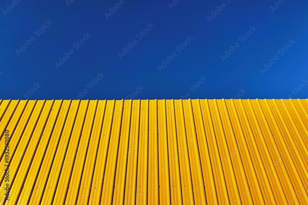 Bright yellow corrugated metal roof panels form bold vertical lines beneath a deep blue sky. Minimalist architectural background with vivid contrast, clean geometry, and strong industrial texture. #1932591080