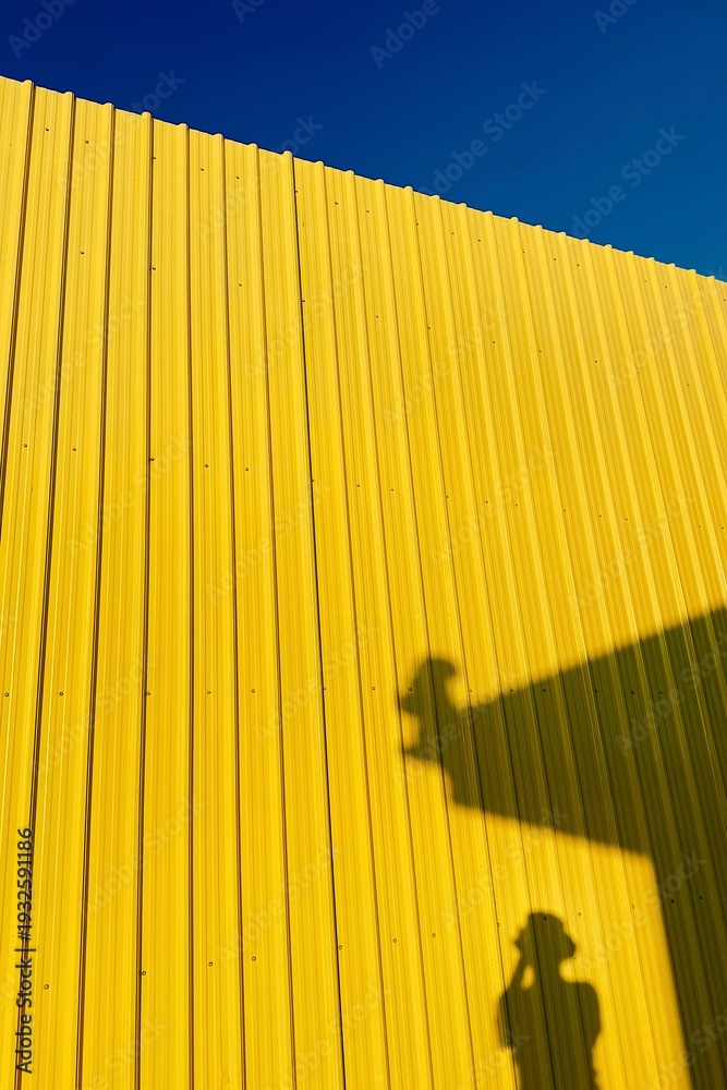 Bright yellow corrugated metal roof panels form bold vertical lines beneath a deep blue sky. Minimalist architectural background with vivid contrast, clean geometry, and strong industrial texture. #1932591186