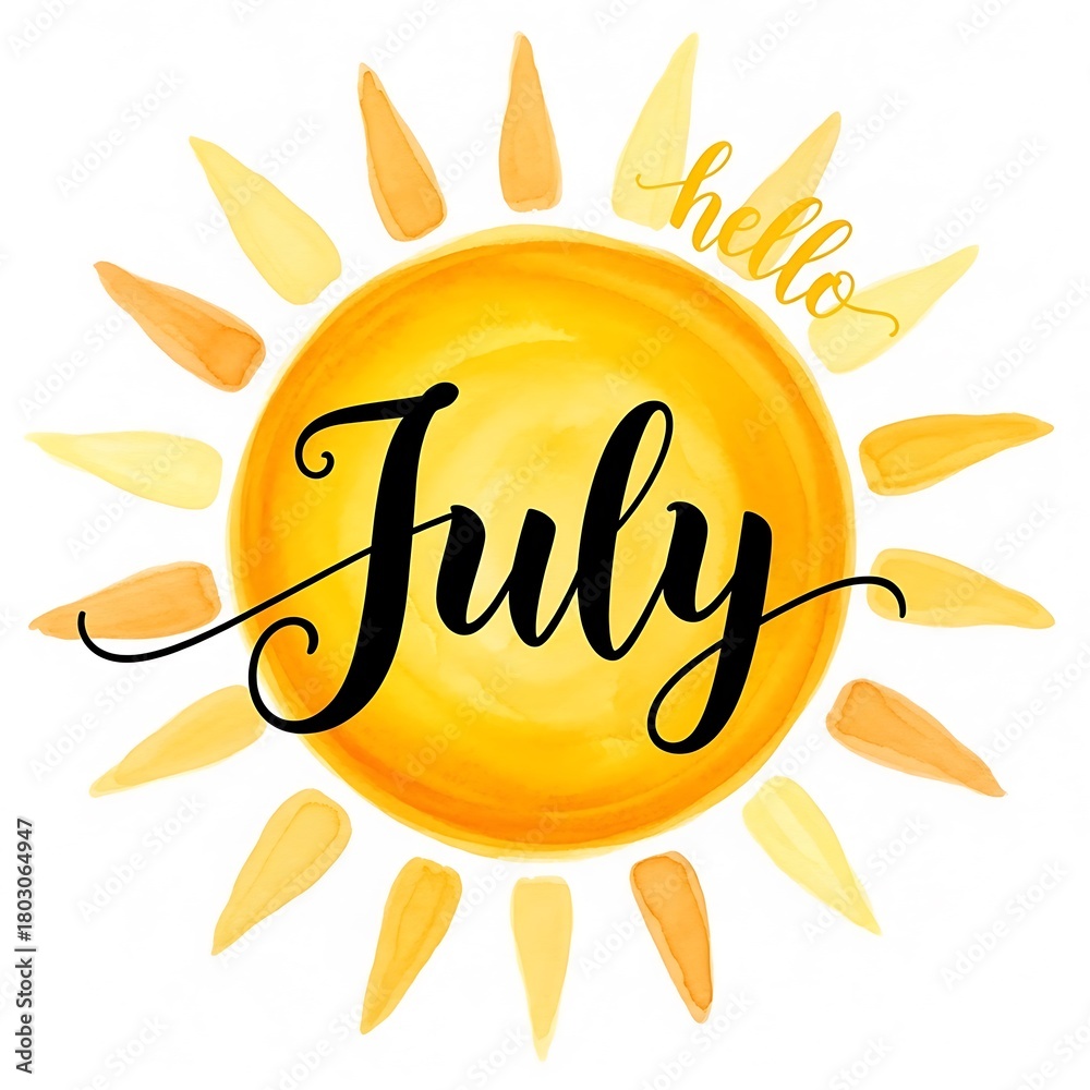 Bright yellow july sun with hello greeting watercolor art design for summer season isolated on white background #1803064947