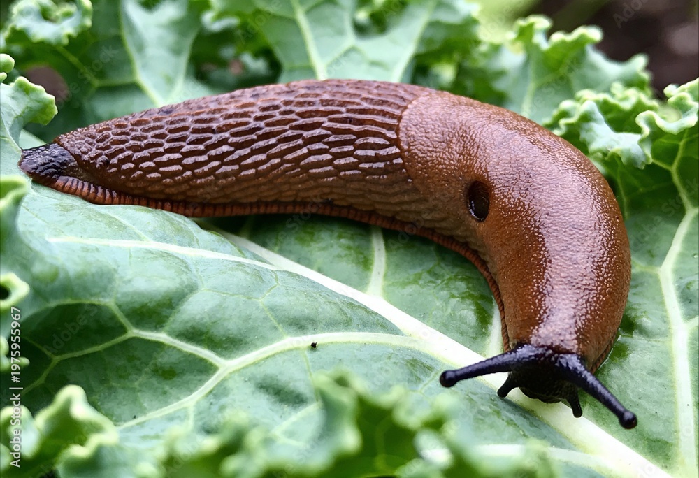 Brown slug crawling across a green cabbage leaf in a garden, close up macro view showing pest damage risk and natural wildlife behavior on vegetable plant #1975955967