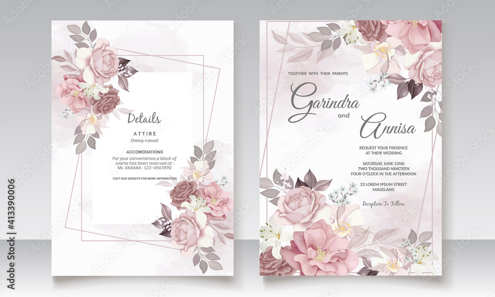 Brown wedding invitation template set with floral frame Premium Vector #413390006