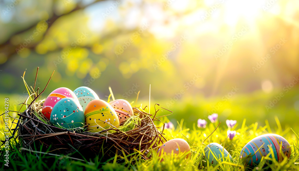 Bunt bemalte Ostereier im Nest mit Frühlingsblumen im Sonnenlicht #1941984278