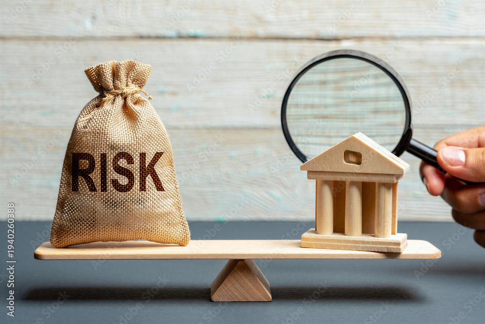 Burlap sack labeled risk on seesaw with wooden building #1940260388