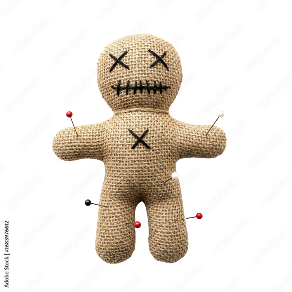 Burlap voodoo doll with colorful pins for a curse #1683976612