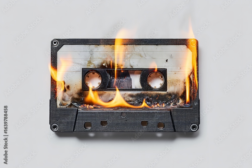 Burning Gray Cassette Tape Against White Background Representing Music Destruction and Retro Audio Concept #1639788458