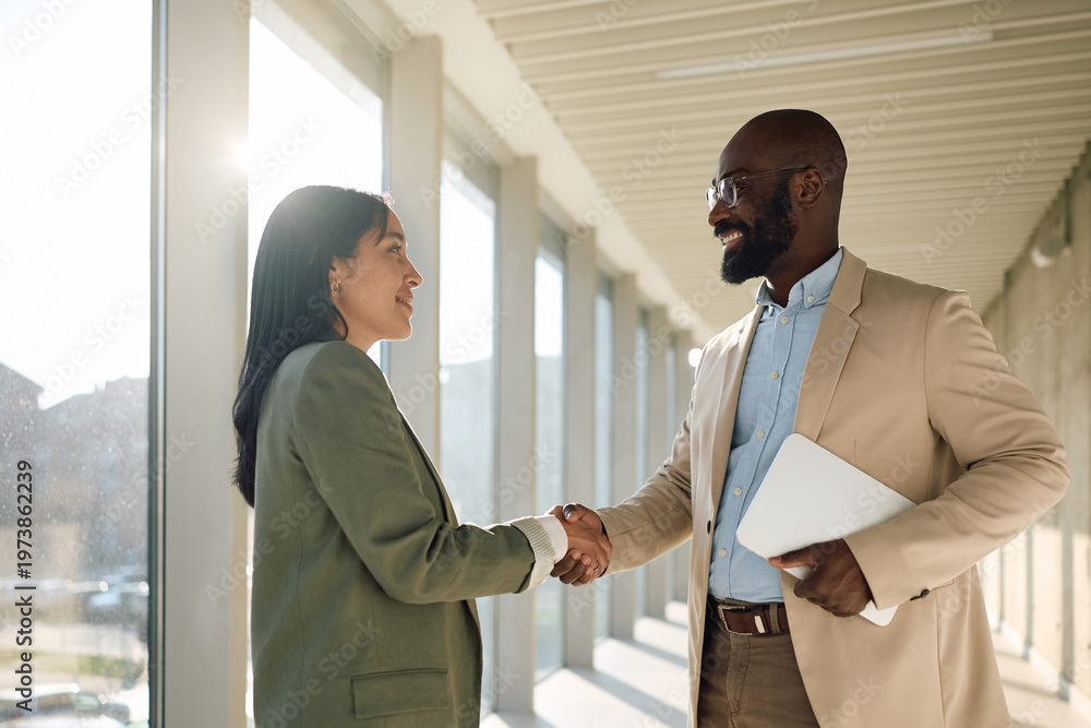 Business colleagues shaking hands after successful meeting in office. #1973862239