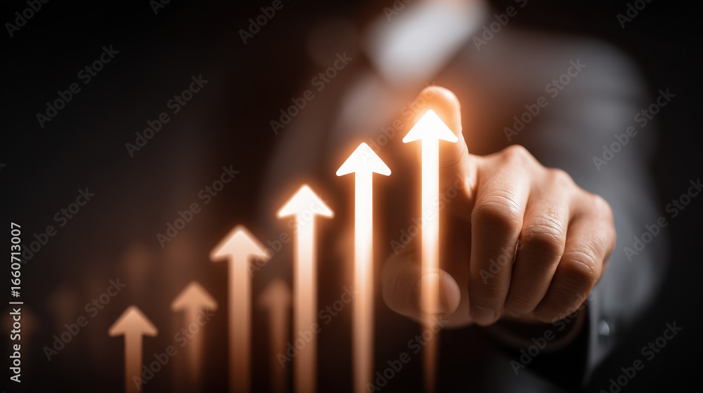 Business growth concept with hand pointing at upward trend represented by glowing arrows. image conveys motivation and success in achieving goals #1660713007