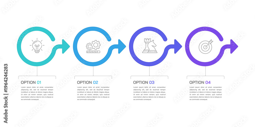Business infographic with 4 circular steps and arrows for workflow process. Presentation, Timeline and Plan. Vector illustration. #1964246283