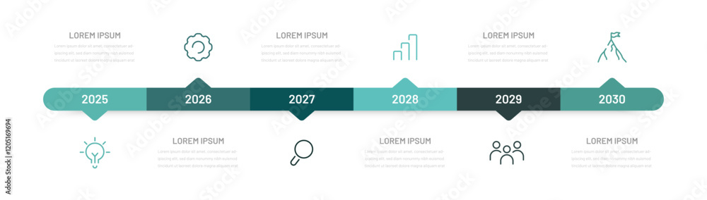 Business infographics for a presentation consisting of 6 steps, stages of achieving a goal. Project planning by year or month, editable icons #1205169694