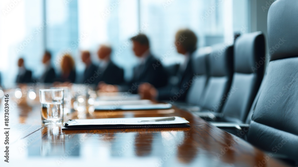 Business meeting in a modern boardroom with blurred figures and leather chairs #1873039416