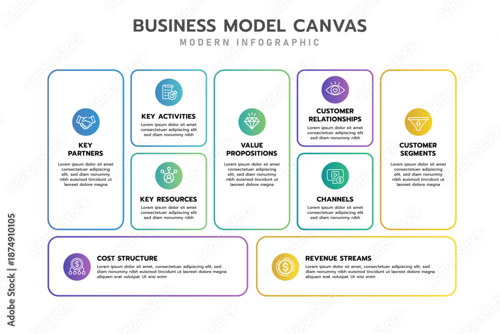 Business model canvas infographic. Structure diagram Infographic template in 9 aspects of business includes partners, activities, resources, value proposition, customers, channels, and revenue. #1874910105