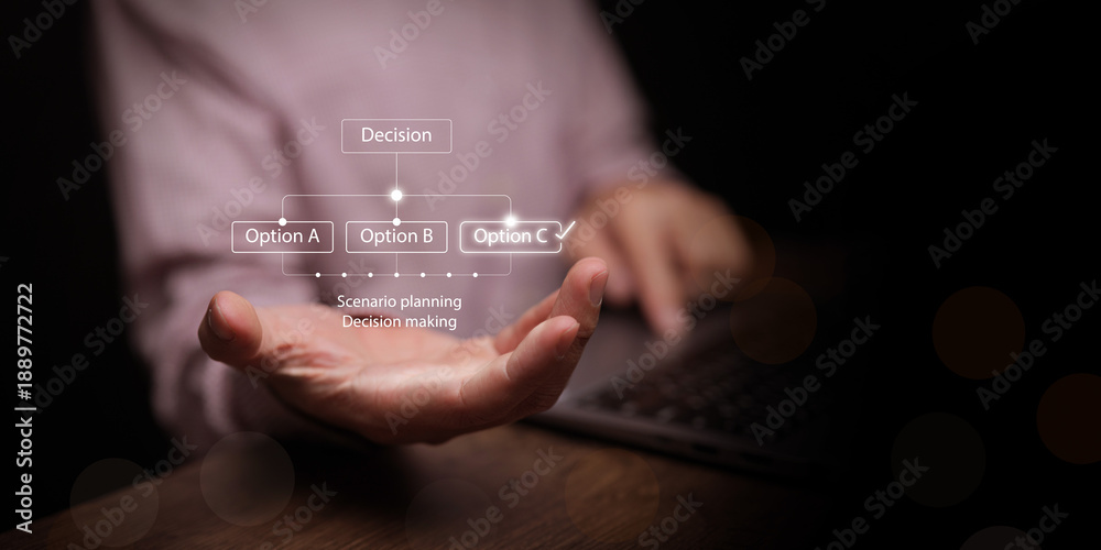 Business plan and decision making concept. Businessman with laptop selecting Option C with scenario planning. Strategic judgment, critical thinking, problem solving, solution analysis, management. #1889772722