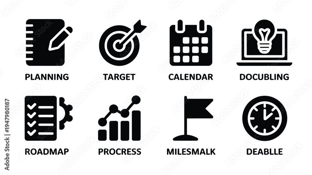 Business planning and strategy icons set including planning target calendar documentation roadmap progress milestone and deadline symbols in black silhouette on white background #1947980187