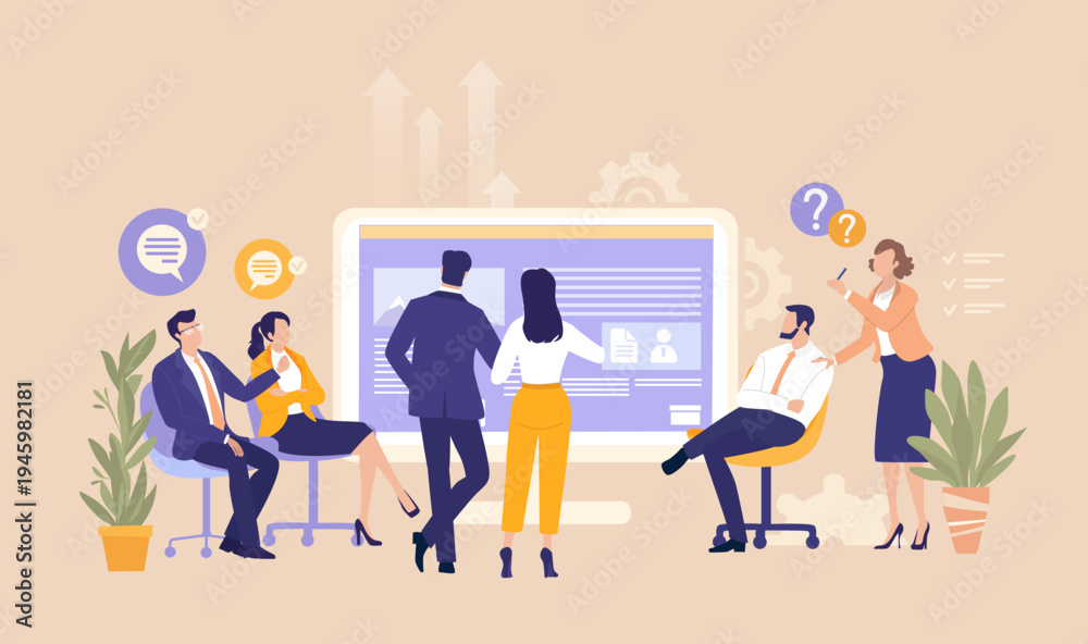 Business professionals gathered for a meeting, discussing strategy and sharing ideas, symbolizing teamwork, communication, corporate planning, leadership, and collaborative decision making #1945982181