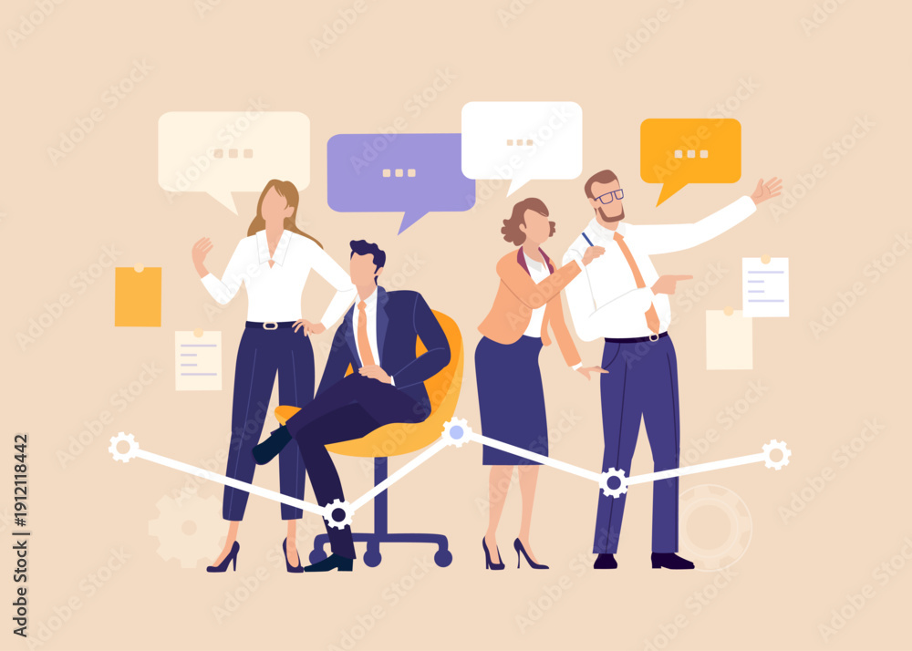 Business Synergy Team. Group portrait of a successful team surrounded speech bubbles, symbolizing collaboration, strategy, communication, and continuous business growth. #1912118442