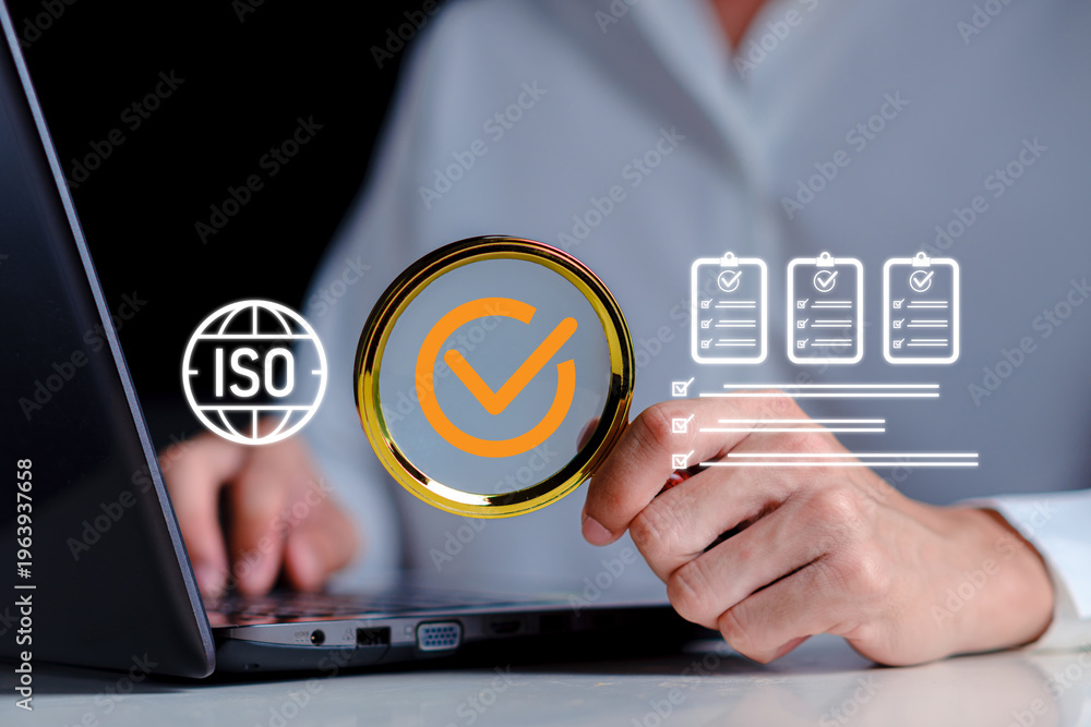 Business using magnifying glass to inspect ISO compliance and quality assurance checklist audit process, certification standards, risk control, and digital workflow validation in corporate management #1963937658