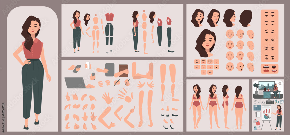 Business woman avatar creation suitable for animation. Generator, constructor of diverse views of eyes, lips, emotion expressions mouth animation and lip sync. Girl character face and body move. #805143718
