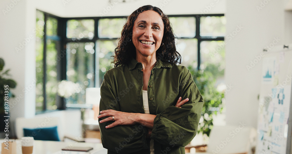 Business woman, portrait and confidence in home office for research, remote work and about us. Mature virtual assistant, freelancer and arms crossed for project management, pride or admin support #1871781355