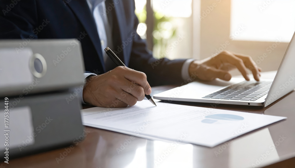 Businessman hand writing notes laptop document pen folder office desk finance report planning focused workflow under warm light productivity and calm concentration in modern workplace #1775334419