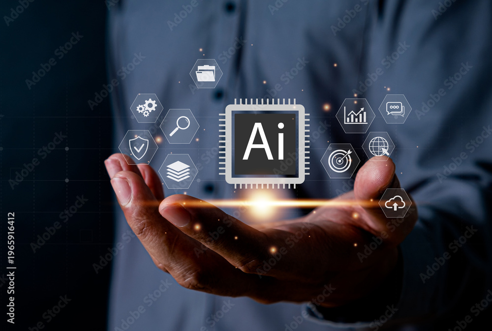 Businessman holding AI chip interface with digital icons, representing artificial intelligence, data analytics, automation, machine learning, cloud computing, and smart technology innovation #1965916412