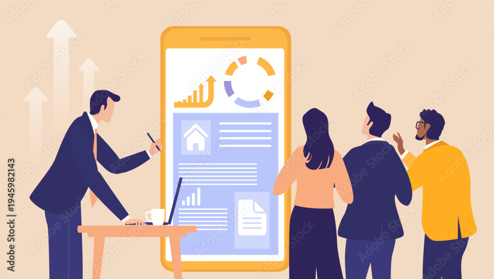 Businessman presenting information on a screen, symbolising corporate communication, data analysis, leadership, training, strategy discussion, and professional knowledge sharing. #1945982143