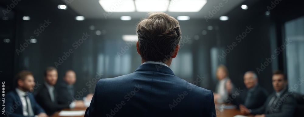 Businessman presenting to his team in dark boardroom setting #1889684942