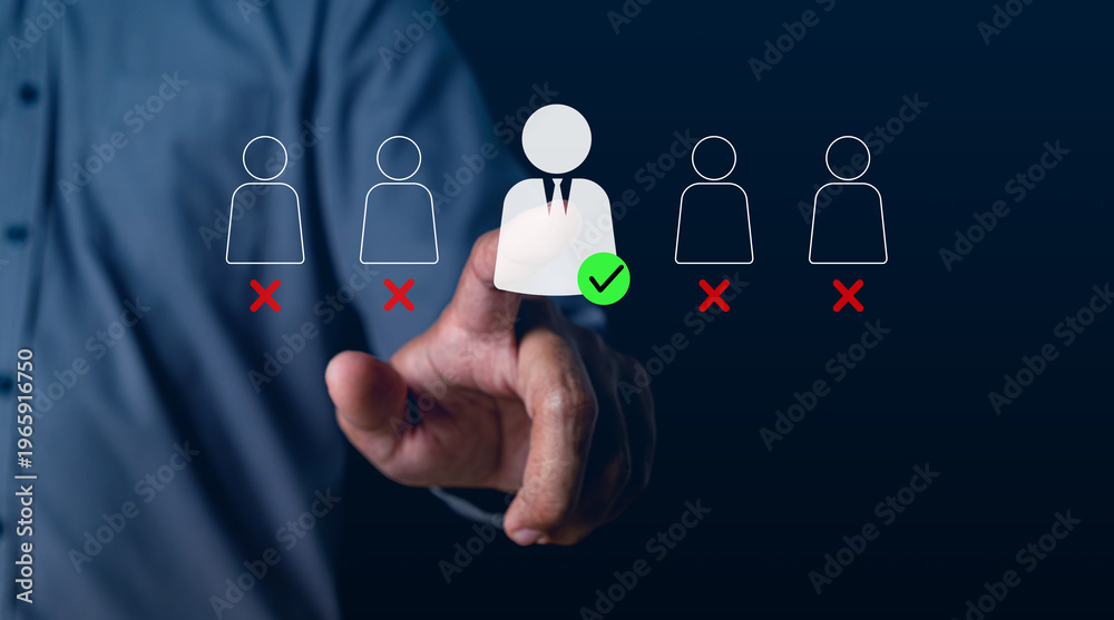 Businessman selecting candidate checkmark among rejected applicants, representing recruitment process, hiring decision, talent acquisition, human resources management and digital employee selection #1965916750