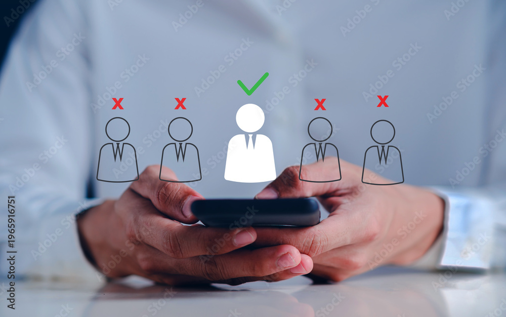 Businessman selecting candidate checkmark among rejected applicants, representing recruitment process, hiring decision, talent acquisition, human resources management and digital employee selection #1965916751