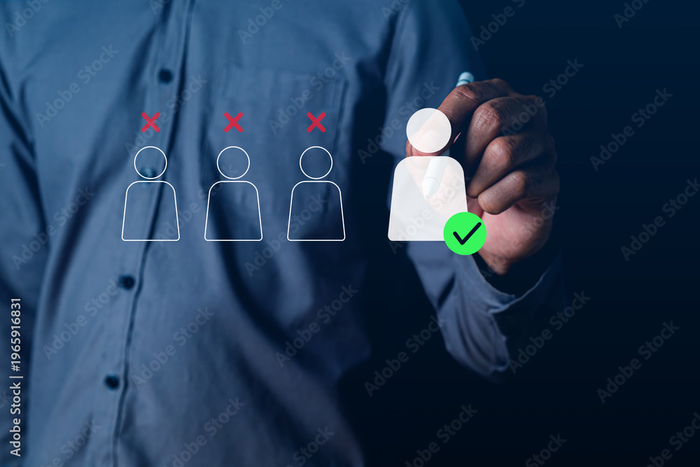 Businessman selecting candidate checkmark among rejected applicants, representing recruitment process, hiring decision, talent acquisition, human resources management and digital employee selection #1965916831