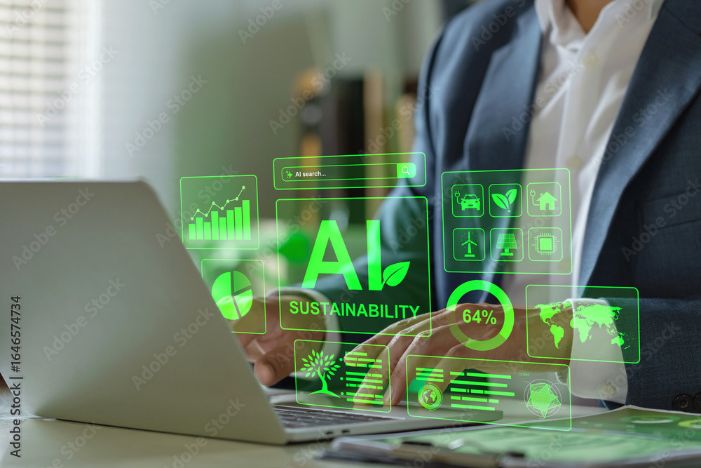 Businessman using laptop with green AI sustainability dashboard, clean energy icons and analytics. Concept of eco-friendly technology, ESG reporting, carbon tracking and digital transformation. #1646574734