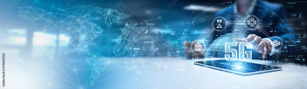Businessman using tab and analysis 5G technology data. high-speed connectivity, low latency communication, wide network coverage, massive IoT support, advanced digital infrastructure #1748647250