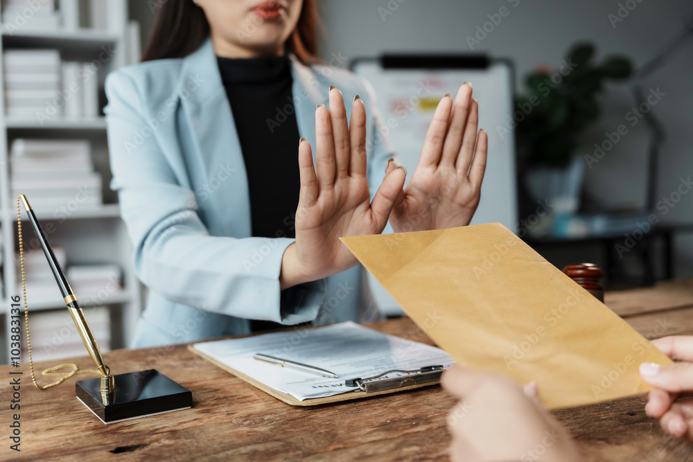 Businesswoman is refusing to receive money in brown envelope, corruption concept #1038831316
