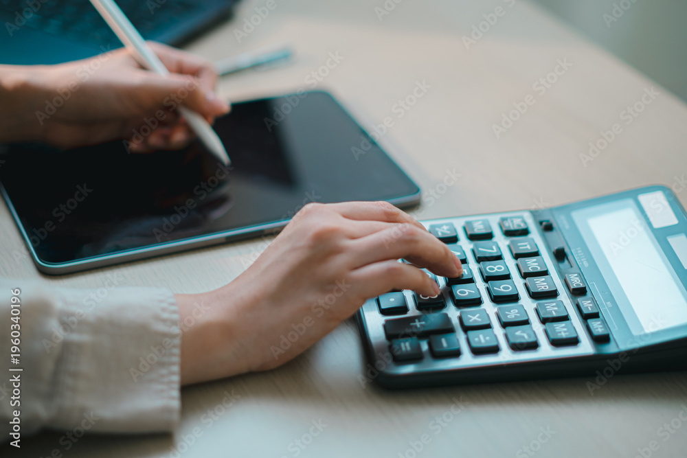 businesswoman using calculator on desk, representing digital finance, accounting, online banking, budgeting, tax management and modern fintech workflow in office #1960340196
