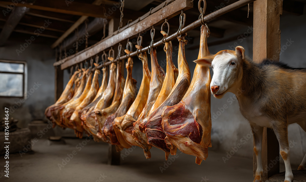 Butcher shop display Inside a rustic butcher shop, a collection of hanging meats is displayed. The scene captures the essence of tradition and the skill of meat processing. #1876414647