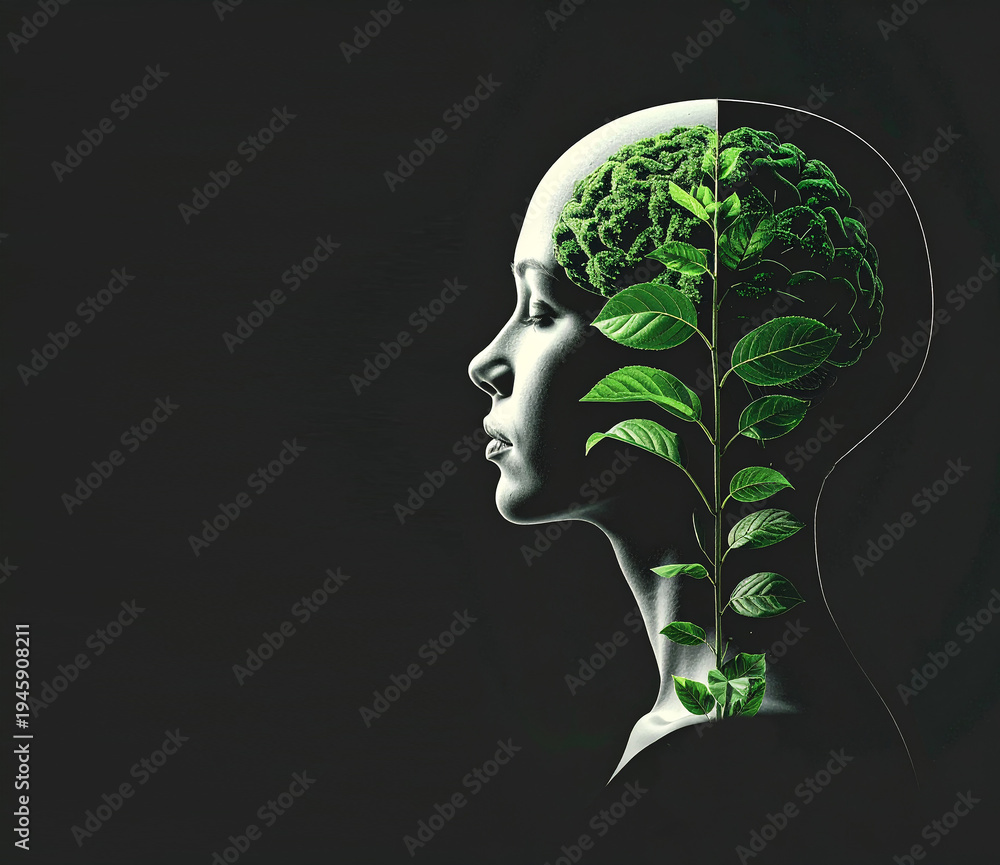 Cabeza humana con cerebro de árbol y hojas verdes, símbolo de mente sana, crecimiento personal, pensamiento positivo, salud mental, conexión con la naturaleza, bienestar mental en fondo negro #1945908211