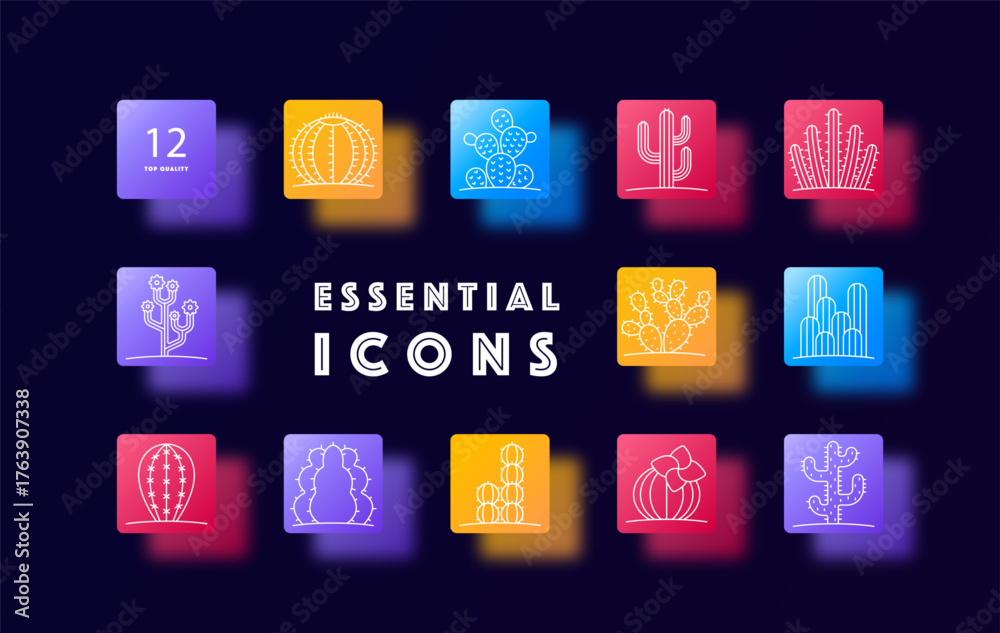 Cactus set icon. Shows different cactus shapes including round, tall, branching, potted, flowering, clustered, desert plants on soft colorful gradients #1763907338