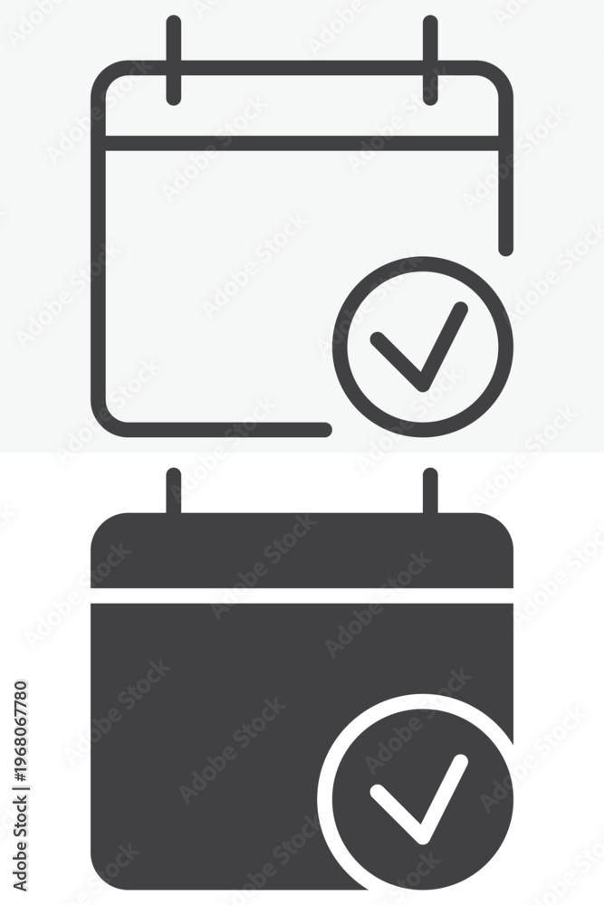 Calendar Check Date icon in line, outline and solid style. Editable stroke vector sign and symbol set for time use, with calendar check date icon in simple versions. #1968067780