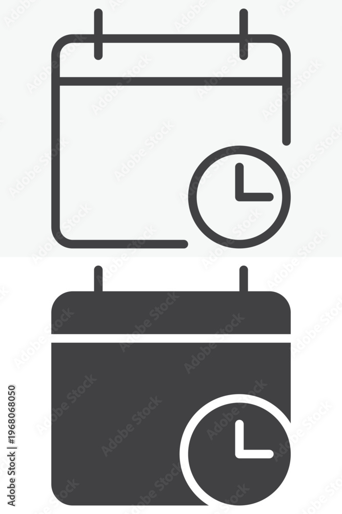 Calendar With Clock icon in line, outline and solid style. Editable stroke vector sign and symbol set for time use, with calendar with clock icon in simple versions. #1968068050