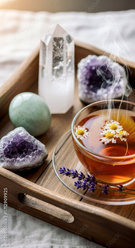 calming spiritual ritual with chamomile tea and healing crystals #1712909925