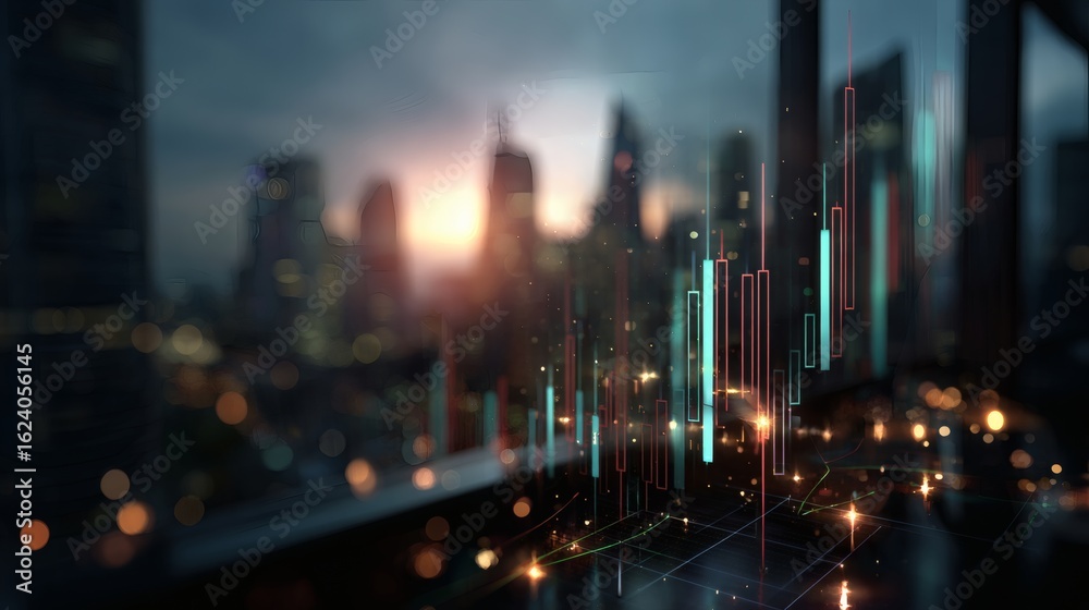 Candlestick charts and financial indicators glowing on a monitor, with a high-rise city view blurred behind #1624056145