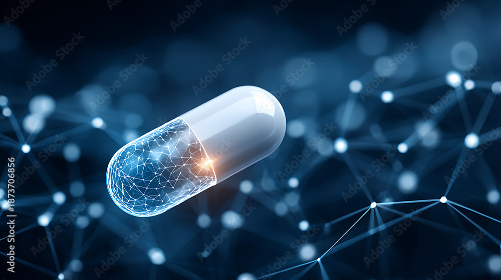 Capsule Floating Above Digital Network With Glowing Lines and Nodes in a Dark Background During Night #1873706856