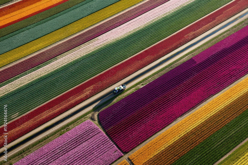 Car driving through vibrant tulip fields in Netherlands #1924164676
